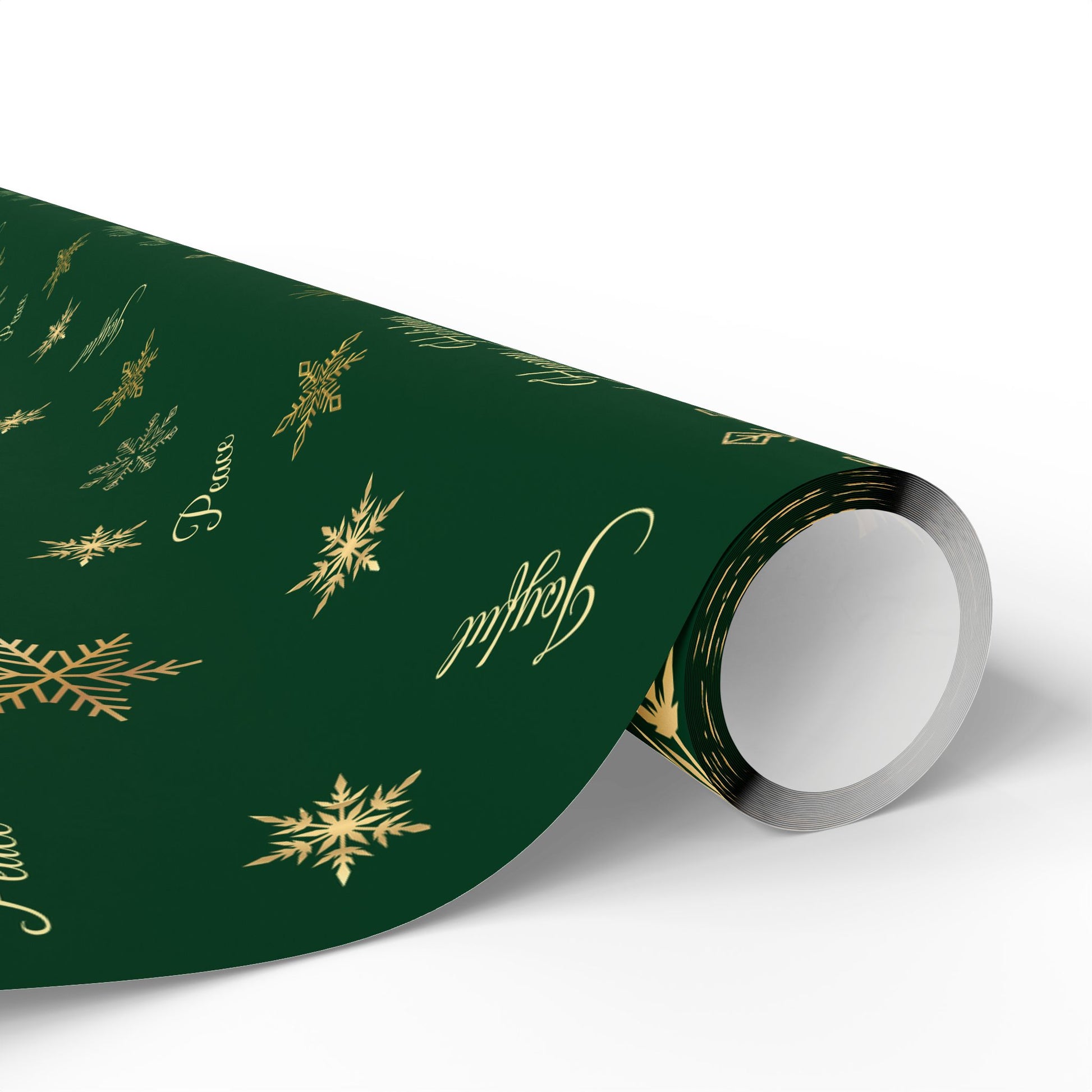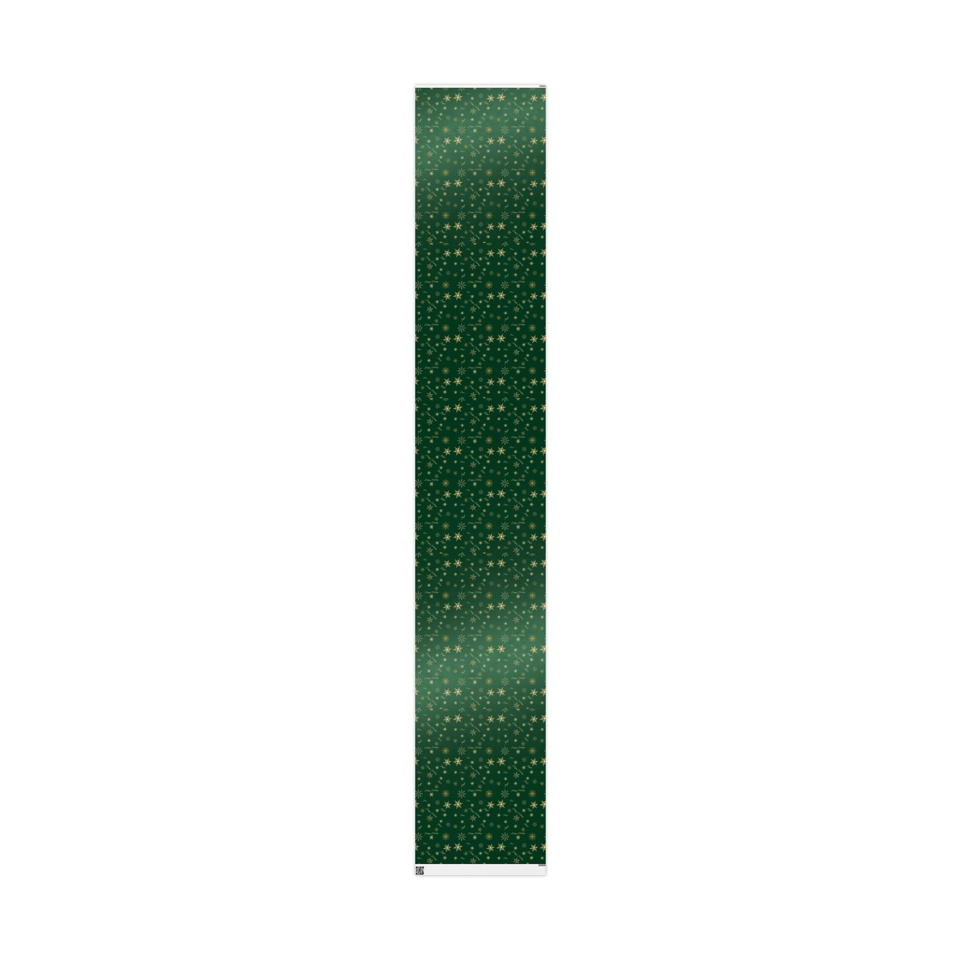 Wrap your gifts in timeless elegance with this rich green and gold holiday wrapping paper. The deep emerald background is adorned with shimmering gold snowflakes and graceful holiday script, bringing a refined and festive look to every package.