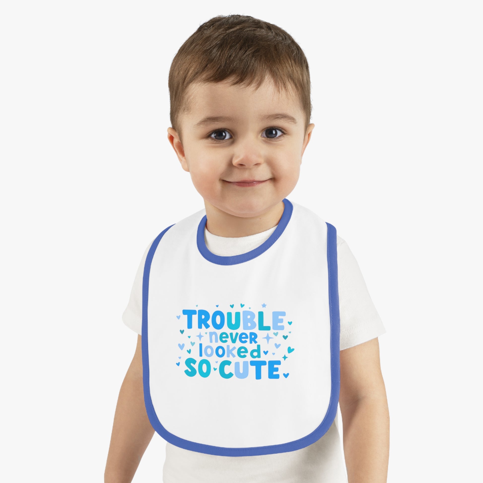 Trouble Never Looked So Cute baby bib. Contrast Trim Jersey Bib